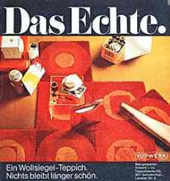 | |  | | | Vorwerk - "Das Echte. Ein Wollsiegel-Teppich. Nichts bleibt länger schön." - Zeitschriftenwerbung