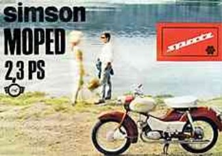 | | |  | | | | | | VEB Fahrzeug- und Gerätewerk Simson Suhl - "Simson Moped 2,3 PS Spatz" - "Wirtschaftlich, robust, wartungsfrei: Zuverlässigkeit in höchster Potenz", Prospekt