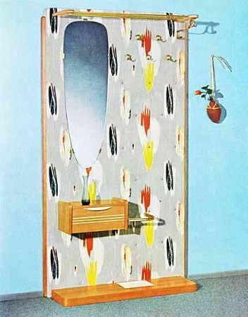 "Diele und Flur", Katalog für "Plastik-Flurgarderoben mit Edelhölzern" und "Edelholzgarnituren", um 1960. Die nachfolgenden Bildunterschriften stammen aus dem Katalog.