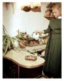 | |  | | | Junggesellinnenzimmer | | Mann mit Graetz Radio "Melodia" und einer Flasche "Advocat"
