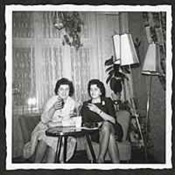 Frauen beschäftigen sich mit Handarbeiten und dem Lesen von Kaufhaus-Weihnachtsprospekten (z.B. vom KaDeWe)