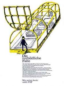 | | CDU-Wahlwerbung: "Erfolg und Erfahrung - Adenauer, Erhard und die erfahrene Mannschaft der CDU/CSU" | | FDP - "Die vorbildliche Falle - Mit Speck fängt man Mäuse. Und mit dem Versprechen "noch mehr Wohlstand für alle" lockt man den Bundesbürger in die Wählerfalle. Der Materialismus regiert, aber die Freiheit erfriert."- Zeitschriftenanzeige | | FDP - ""Frei" sein, das liegt mir nicht - Man sitzt im goldenen Käfig drin, und alles ist ja so bequem. Aber wei's draußen aussieht? Wer die Zeitungen verfolgt, wer sich kritisch umschaut, weiß: Es ist nicht alles Gold, was glänzt." - Zeitschriftenanzeige