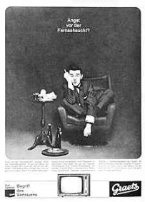 "Angst vor der Fernsehsucht? Unnötig! Denn das Fernsehprogramm ist wie ein Menü mit vielen Gängen. Wer zuviel ißt, verdirbt sich den Magen. Und wird künftig mäßiger sein. Das regelt sich von ganz allein. Also sagen Sie "ja" zum eigenen Fernsehgerät."