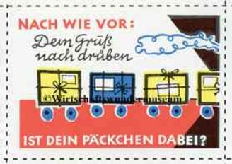 "Nach wie vor: Dein Gruß nach drüben – Ist Dein Päckchen dabei?", gummierte Marke (schätzungsweise um 1964)   "Noch öfter Freude spenden: Briefe Päckchen Pakete nach drüben senden", gummierte Marke (schätzungsweise um 1964)