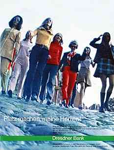 "Frauen dürfen schick und modern sein für "ihn". Sie dürfen putzen wie die Teufel und kochen wie die Götter. An ein Bankkonto dürfen sie nicht? Mehr Vertrauen, meine Herren! Abgezählte Scheine in der Haushaltstüte passen nicht zu einer modernen Frau. Sie zahlt mit Scheck und Scheckkarte." - Dresdner Bank, Zeitschriftenwerbung (1970)