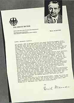 "Dr. Erich Mende - Mitglied des Deutschen Bundestags - Bundesvorsitzender der Freien Demokratischen Partei - Bonn, im Juil 1961"