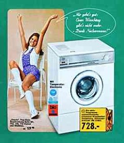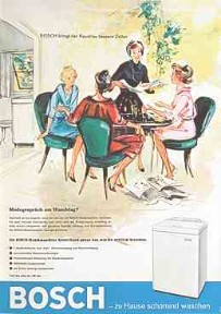 | | "Bosch bringt der Hausfrau bessere Zeiten" - "Modegespräch am Waschtag? Natürlich ist das möglich, wenn Sie sich auf die BOSCH Waschmaschine verlassen." (1959)