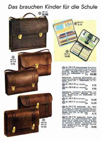 |  | Da ich aus entsprechenden Rückmeldungen weiß, dass sich mittlerweile auch Schulklassen im Unterricht auf meinen Seiten "Spielzeug von früher" anschauen, hier ein Bild aus einem Versandhauskatalog des Jahres 1962. Stylische bunte Schultaschen mit Einhörnern und Feuerwehrautos drauf gab es damals schlicht und einfach noch nicht zu kaufen. Die Schule war eine ernste Angelegenheit, Schüler wurden bisweilen sogar noch geohrfeigt und sowas hätte sich einfach nicht gehört. Alle Tornister sahen so aus wie meiner oder zumindest ganz ähnlich. Was mich beim Betrachten des Versandhausangebots jedoch verwundert hat, ist der Umstand, dass es die "Schulranzen" in unterschiedlichen Ausführungen für Jungen und Mädchen zu kaufen gab. Die mit den zwei Verschlussschnallen sind für Mädchen, die mit einer für Jungen. Warum wohl? Die für Mädchen sehen geringfügig kleiner aus - vielleicht waren die leichter? Wenn jemand zur Aufklärung beitragen kann, freue ich mich über eine Email! KONTAKT