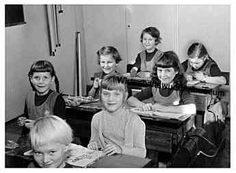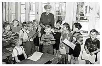 | | "Puppenschule" mit Püppchen in selbstgebautem Gehäuse, 1950er Jahre |  | Rege Beteiligung am Unterricht (zumindest für den Fotografen) in einer 1a in Berlin Lichterfelde |  | |  | Lehrerin auf dem Schulhof (um 1958)