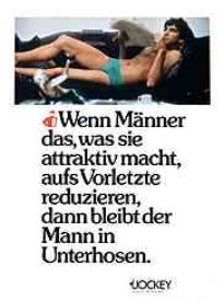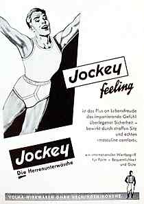 | |  | "Jockey - feeling ist das Plus an Lebensfreude, das imponierende Gefühl überlegener Sicherheit - bedingt durch straffen Sitz und echten "masculine comfort"" (1958) | | "Benger Ribana Herren - Unterwäsche - die Herrenwäsche unserer Zeit" - "scheuerfester, besser denn je!" (1958)