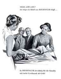 "Schick, nicht wahr? Sie trägt ein Kleid aus RIEDINGER-Stoff... - Ja, RIEDINGER ist richtig für die Kundin mit mehr Geschmack als Geld!"