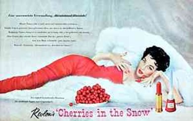 | |  | | | Revlon's "Cherries in the Snow" - "Ein einfach bezauberndes Kirschrot für strahlende Lippen und Fingernägel - Blonde Frauen läßt es noch zarter und entzückender erscheinen... - Dunkle Frauen gewinnen einen geheimnisvollen, nur schwer zu übertreffenden Zauber... - Rothaarige Frauen bringt es so wunderbar zur Geltung, daß es gefährlich sein könnte..."