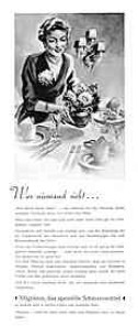 | | ""Wir haben heute Gäste" - das bedeutet für die Hausfrau neben festlicher Vorfreude meist viel Arbeit und Mühe. (...) Vor dem Make-up rasch eine Migränin-Tablette, denn sie vertreibt in wenigen Minuten Kopfschmerz, Abgschlagenheit und Müdigkeit. Unlust, Blässe und glanzlose Augen weichen dann schnell der alten Frische und dem gewohnten guten Aussehen." |